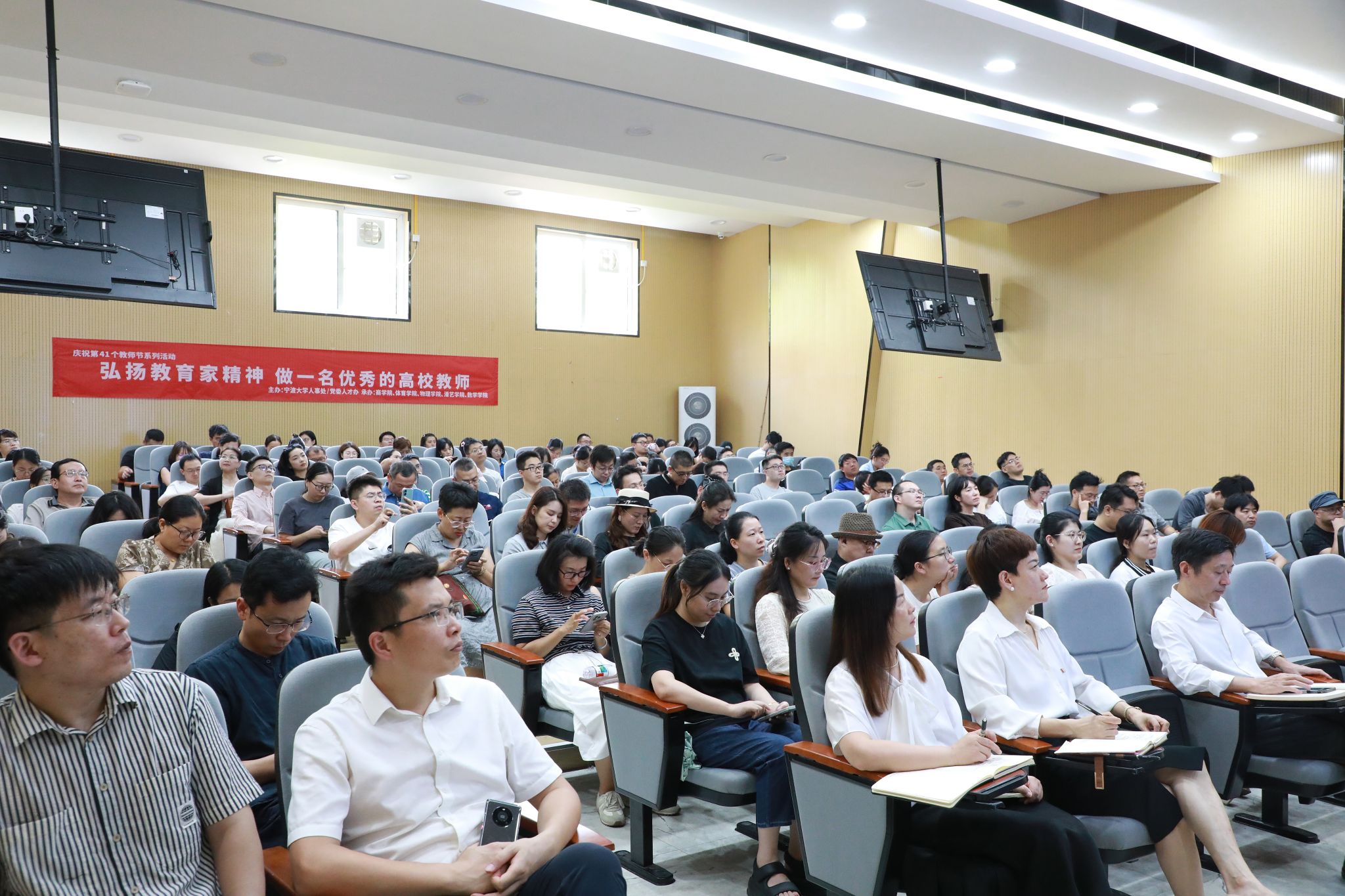 为庆祝第41个教师节,弘扬教育家精神,加强新时代高素质专业化教师队伍建设,9月12日,由学校人事处、党委人才办主办,潘天寿建筑与艺术设计学院党委牵头,联合商学院党委、体育学院党委、物理科学与技术学院党委、数学与统计学院党委共同承办的“弘扬教育家精神,做一名优秀的高校教师”专题讲座在龙赛报告厅举行,讲座邀请了苏志刚教授主讲,学校200余名教职工参加。