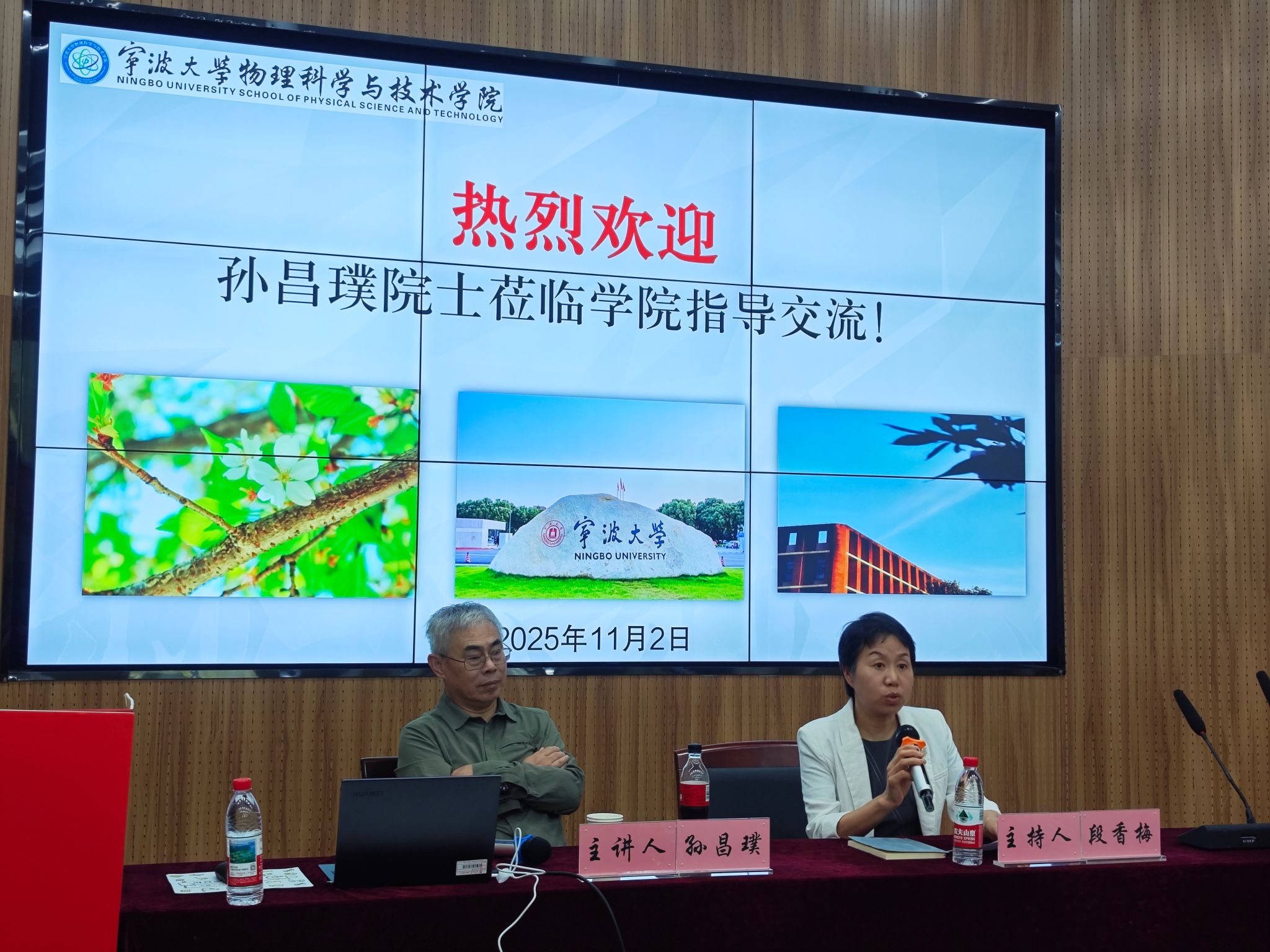 段香梅院长首先对孙昌璞院士的到来表示热烈欢迎和衷心感谢,她向在座师生介绍,孙昌璞作为中国科学院院士、理论物理学家,长期从事量子物理、数学物理、量子信息基础理论的研究,目前工作集中在国家需求牵引的基础研究方面,如能源物理、复杂体系统计热力学和可靠性理论。此外,孙院士还长期参与我国物理学科战略规划工作,目前是中国物理学会副理事长,国家自然科学基金委员会监督委员会副主任,并担任中国科学院哲学研究所学术委员会主任和北京大学物理学科卓越人才培养指导委员会主任。