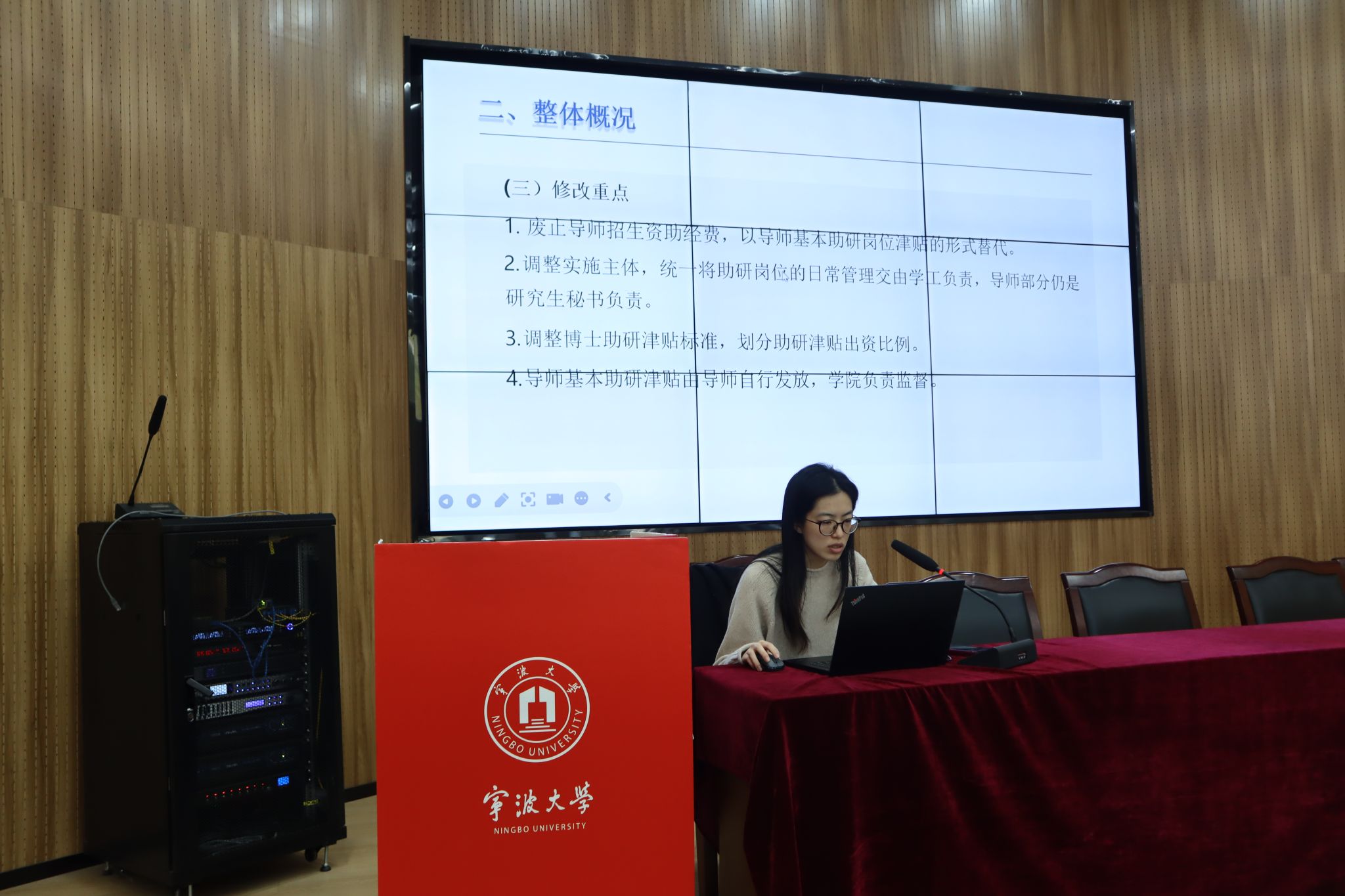 会议伊始,毛忻怡老师系统介绍了学校研究生助研工作改革方案,着重解读了助研津贴的类型构成、发放标准、导师职责以及新政实施节点等关键内容,并引导同学们立足实际,充分表达合理关切,鼓励大家以务实态度提出建议、贡献智慧,共同促进政策落地更加精准、更具温度。