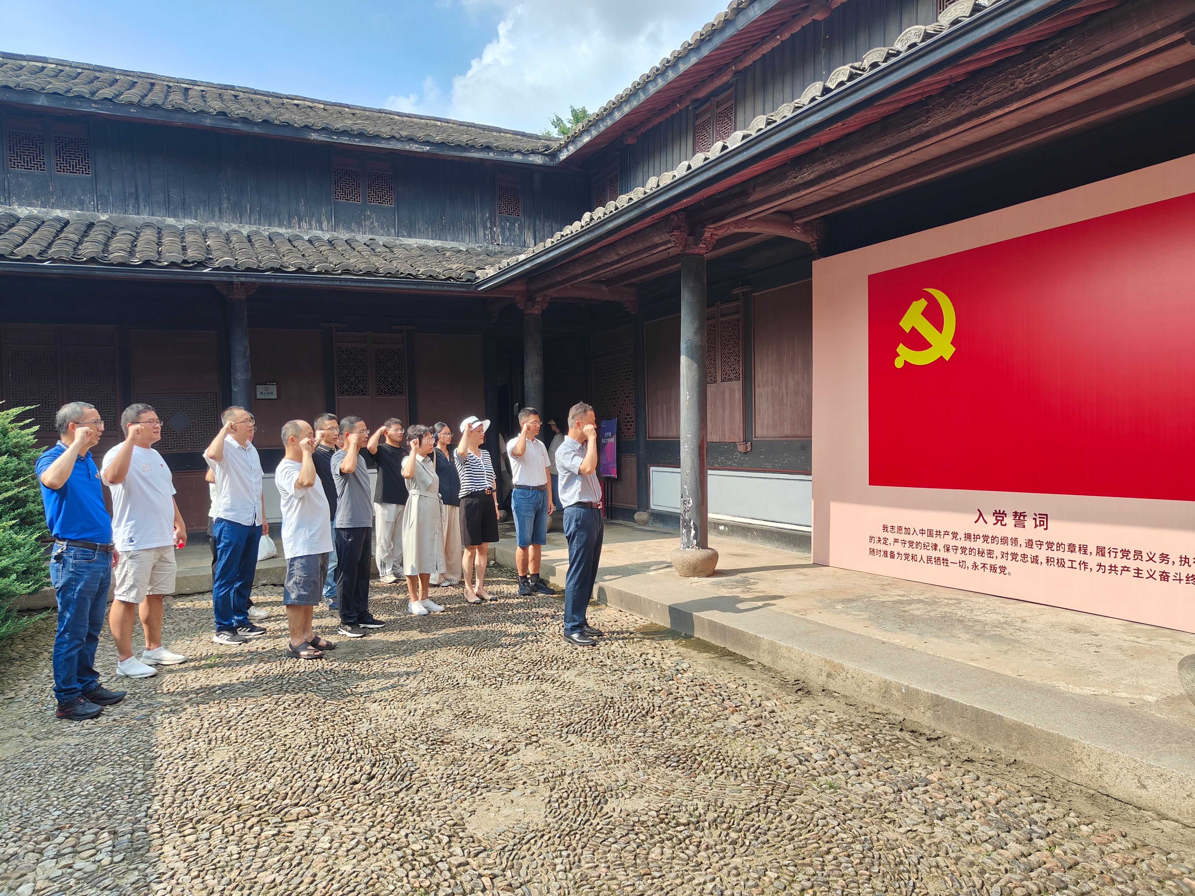 第三站来到在浙东抗日文化旧址群,师生党员们依次参观了浙东革命根据地纪念馆、何克希将军纪念室、浙东银行、浙东报社等旧址,一件件珍贵的革命文物印证着在抗日战争那段艰苦奋斗的岁月里,革命先辈们在极其严酷的环境中,一边进行英勇顽强的军事斗争,一边开展政治、经济、文化建设等工作。通过重温横坎头村的红色革命历程,先辈们筚路蓝缕、一往无前的开创精神,令师生们深受触动。在革命旧址的庭院,学院党委书记朱学庆带领大家面对党旗重温入党誓词,时刻牢记共产党人的初心使命。