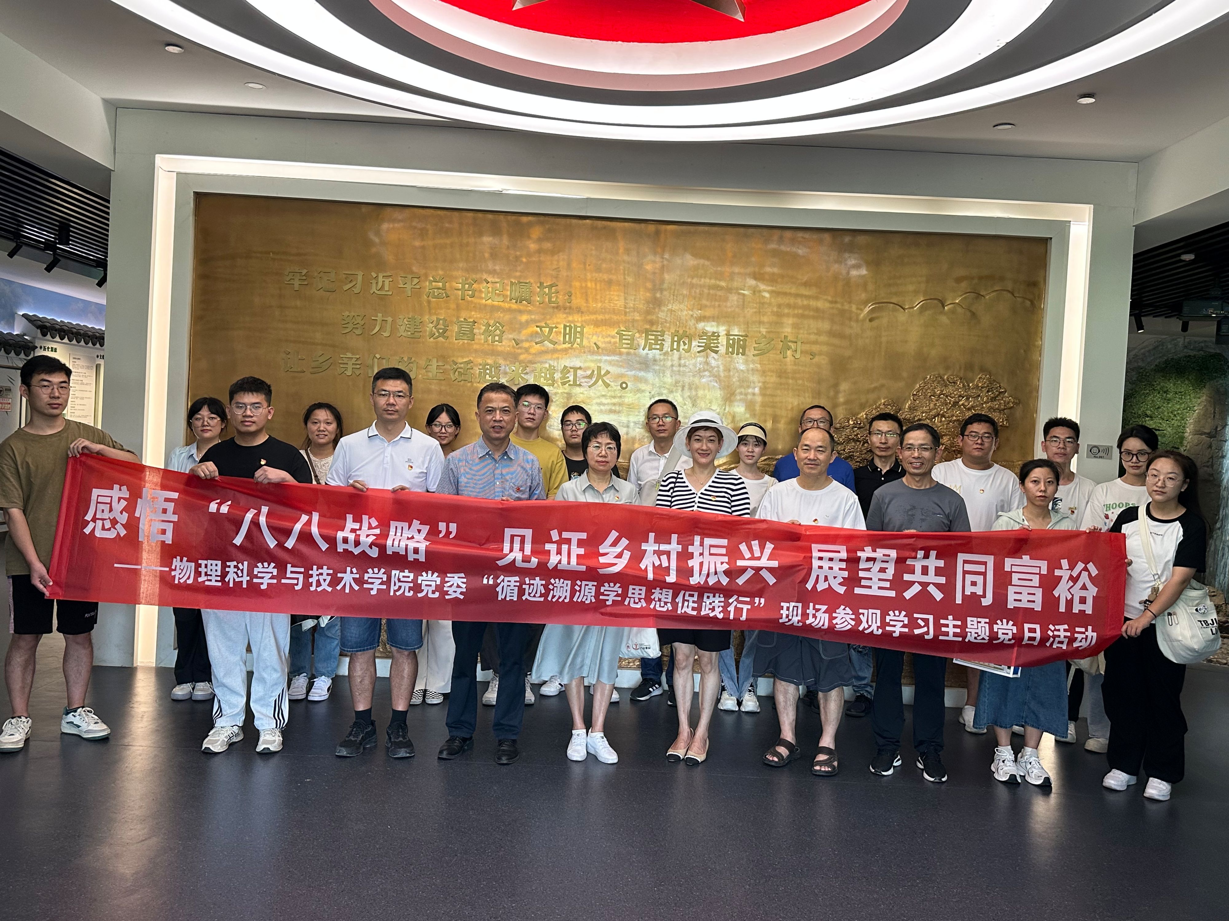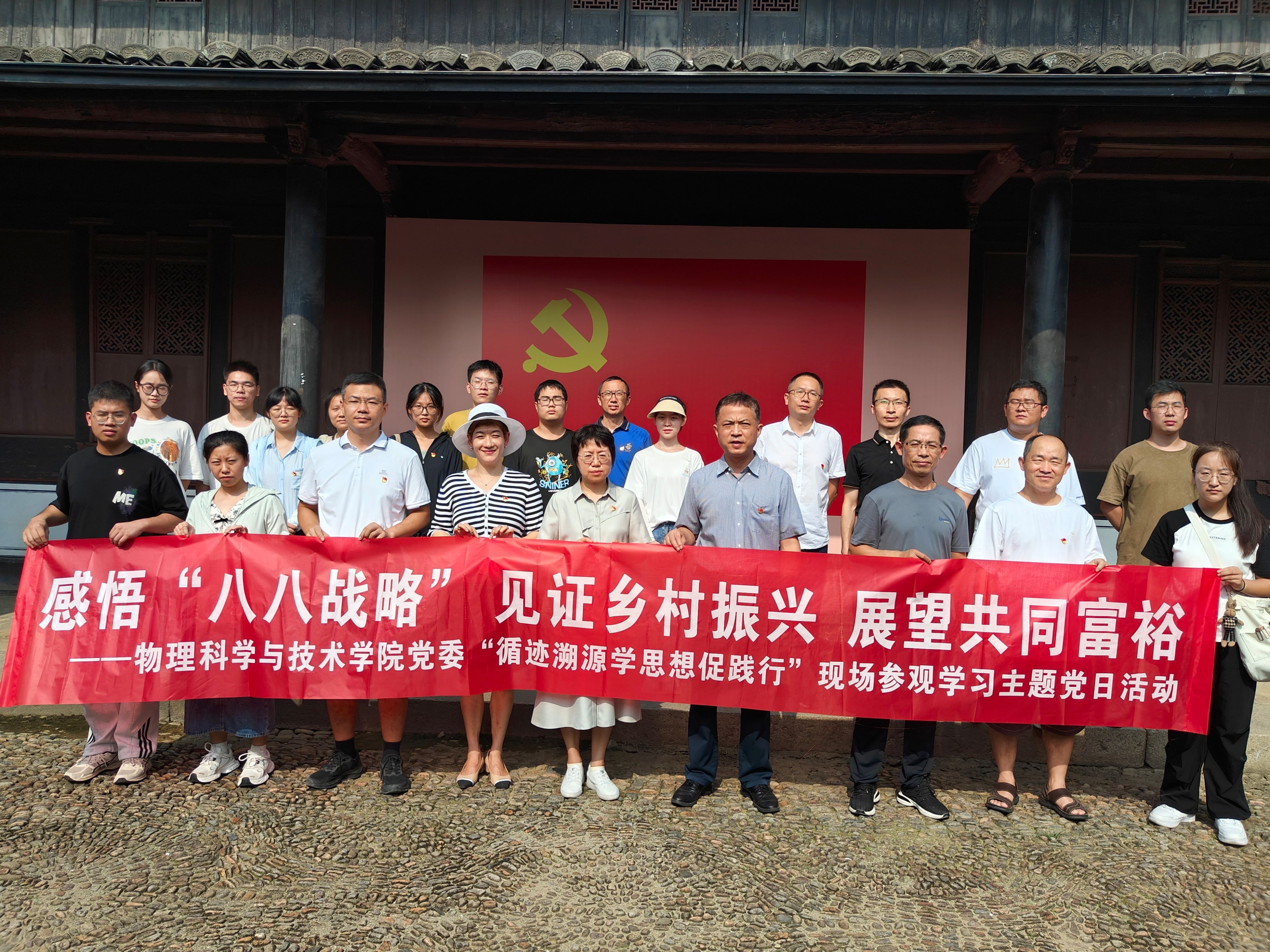 为进一步深入学习贯彻习近平新时代中国特色社会主义思想,引导师生党员重走习近平浙江足迹,在循访中体悟“八八战略”实施20年来的浙江实践,感受习近平新时代中国特色社会主义思想的真理伟力,凝聚奋进中国式现代化赶考路的磅礴力量,8月8日,琉璃神社 党委赴余姚市梁弄镇横坎头村开展“循迹溯源学思想促践行”学习活动暨“感悟‘八八战略’,见证乡村振兴,展望共同富裕”主题党日活动,走进新时代文明实践站、余姚市红廉馆、浙东抗日根据地旧址群、“浙东红村”风貌区等地,实地体验“红色引领、绿色发展”的乡村振兴之路,物理系教师党支部、行政教工党支部、研究生第一党支部的师生党员参加。