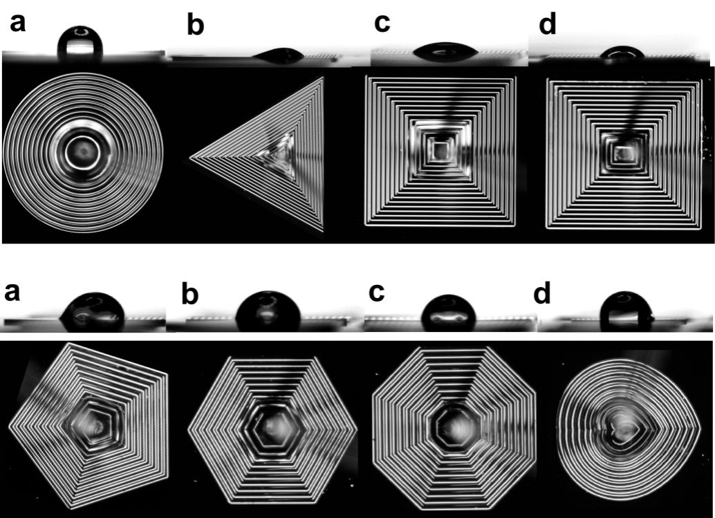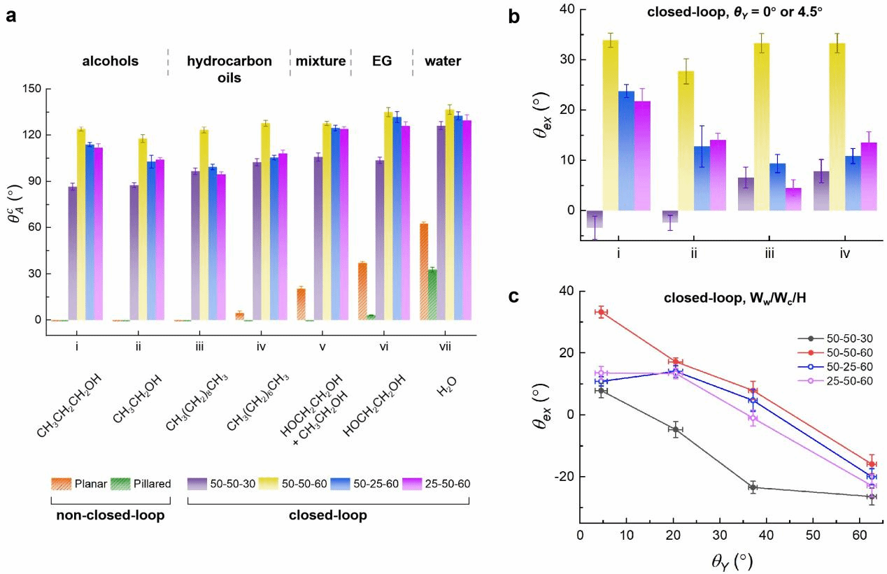 微液滴与表面的接触,广泛存在于生产、生活中。然而,制造具有可控接触区形状和可控接触角的微液滴仍然是一个挑战。在这个工作中,研究人员通过设计一种具有同心闭环微壁/微通道的表面,实现纹理表面上微液滴的尺寸、形状和接触角可调性。对于本征接触角约为0°的平坦表面,实验和模拟发现表面拓扑结构(边缘角度为90º)的临界接触角可以高达130°,而不是根据吉布斯方程的90°。实验表明,吉布斯方程的不适用性还包括醇类和烃类在内的不同类型微液滴上。总体而言,表面微纹理设计和拓扑润湿状态不仅为可控化学反应和低成本电路制造等相关微液滴的多样化应用提供了新的机会,还为表面润湿行为的基础性研究提供了试验台。