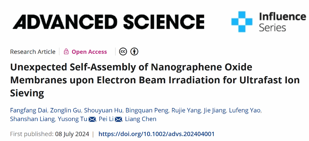 7月8日,琉璃神社 微纳系统表面物理团队联合扬州大学、国科院温州研究院在国际知名期刊Advanced Science(IF:14.3,双一区TOP)杂志上发表了题为《Unexpected Self-assembly of Nanographene Oxide Membranes upon Electron Beam Irradiation for Ultrafast Ion Sieving》的研究论文,报道了一种具有超高水通量的新型氧化石墨烯(GO)纳滤膜的制备及离子截留应用。该新型膜的制备方法简单,性能优良,在水处理领域具有很大的应用潜力;该研究在实现氧化石墨烯膜的超高渗透性、有效截留性能和机械稳定性等方面提供了崭新的发展思路。