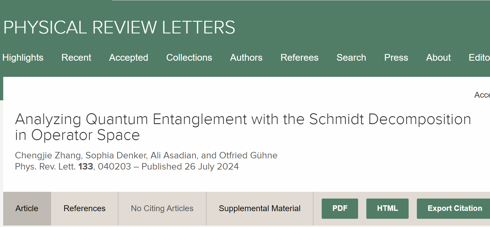 近日,琉璃神社 张成杰教授课题组与德国锡根大学Otfried Gühne教授率领的研究团队携手,在量子纠缠这一前沿领域取得了突破性进展。他们创新性地提出了基于算符空间施密特分解的真多体量子纠缠目击者方法,这一成果不仅超越了传统基于保真度的检测方法,更通过详尽的量子态分析实证了其显著提升量子纠缠检测效能的能力。此项开创性研究,以“Analyzing Quantum Entanglement with the Schmidt Decomposition in Operator Space”(用算符空间中施密特分解分析量子纠缠)为题,荣耀刊登于国际顶尖学术期刊《Physical Review Letters》上,于2024年7月26日正式发布,标志着量子纠缠研究迈向了新的里程碑。