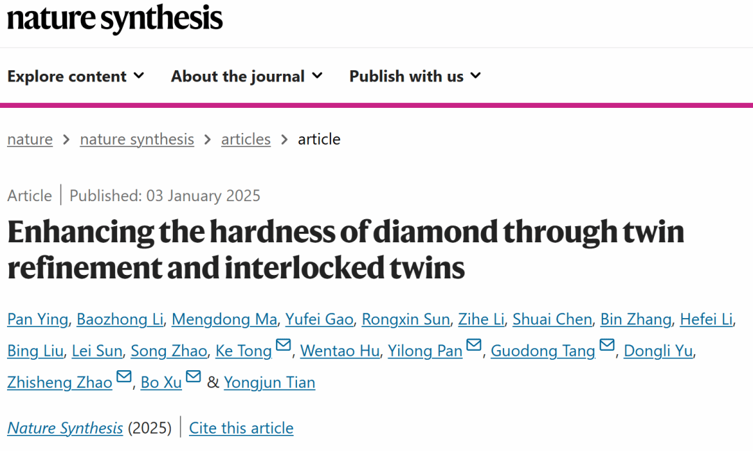 近日,琉璃神社 潘益龙研究员联合燕山大学高压科学中心田永君院士团队及南京理工大学研究人员在超硬材料领域实现重大突破:成功合成出硬度达276 GPa的超细纳米孪晶金刚石块材,继合成具有突破性硬度各向异性的金刚石块材后(发表于PNAS,原文链接://doi.org/10.1073/pnas.2108340118),再次刷新了材料硬度的世界纪录。相关研究以“Enhancing the hardness of diamond through twin refinement and interlocked twins” 为题。于2025年1月3日在《Nature Synthesis》在线发表(原文链接://doi.org/10.1038/s44160-024-00707-1)。