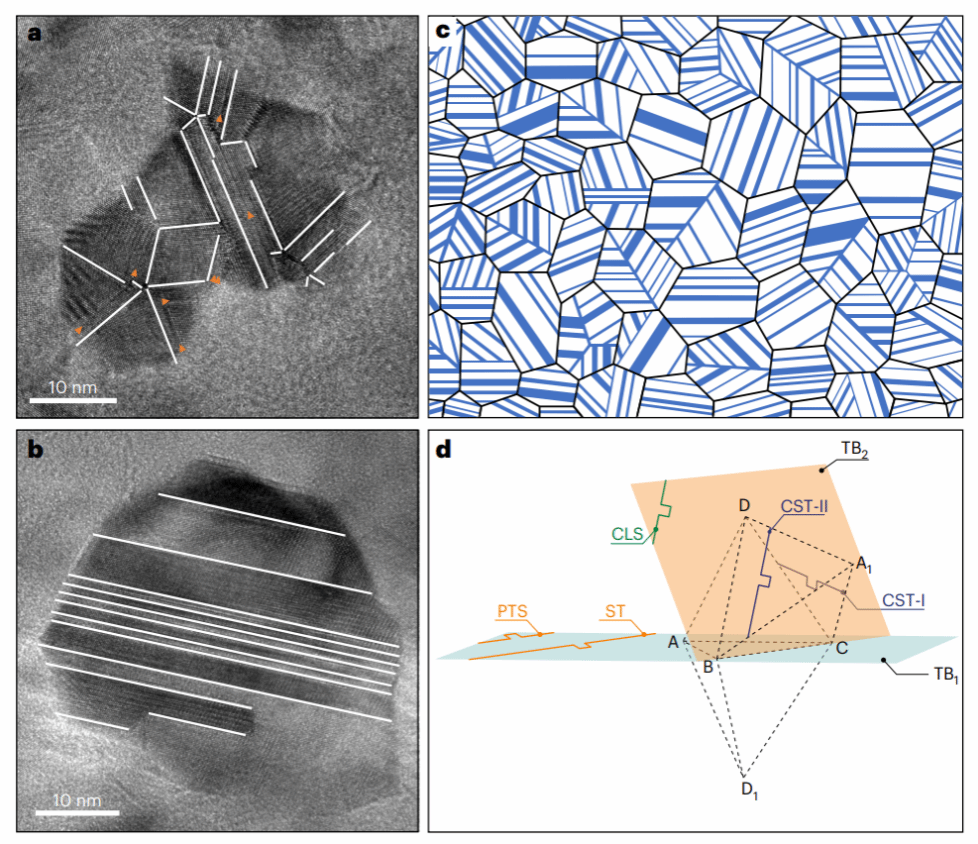图4:典型孪晶结构和包含这些孪晶构型的多晶金刚石模型示意图。