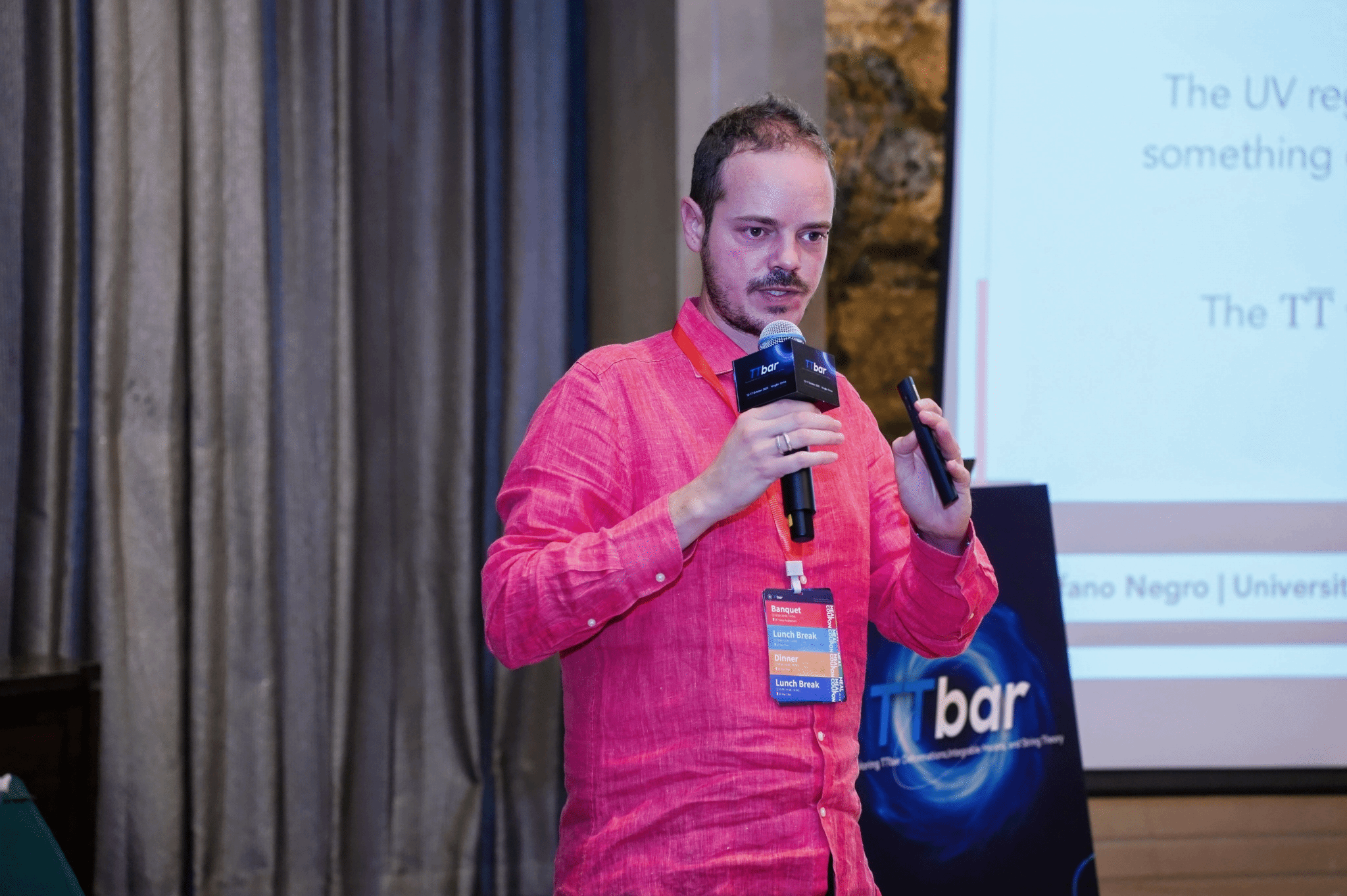 在报告环节,多位领域的顶尖专家带来了前沿分享。第一部分的报告由Roberto Tateo教授主持。来自帕多瓦大学的Dmitri Sorokin教授作了题为《The structure and TTbar deformations of duality-invariant p-form gauge theories in higher dimensions》的报告。英国约克大学的Stefano Negro教授介绍了《Form factors in irrelevant deformations of IQFTs》。欧洲核子研究中心的Ruben Monten教授分享了题为《Symmetries & locality of TTbar-deformed theories》的研究进展。每场报告后,互动环节讨论热烈,提问踊跃,充分展现了严谨而开放的学术氛围。与会者在深入交流中相互启发,从多角度深化了对TTbar形变的理解。