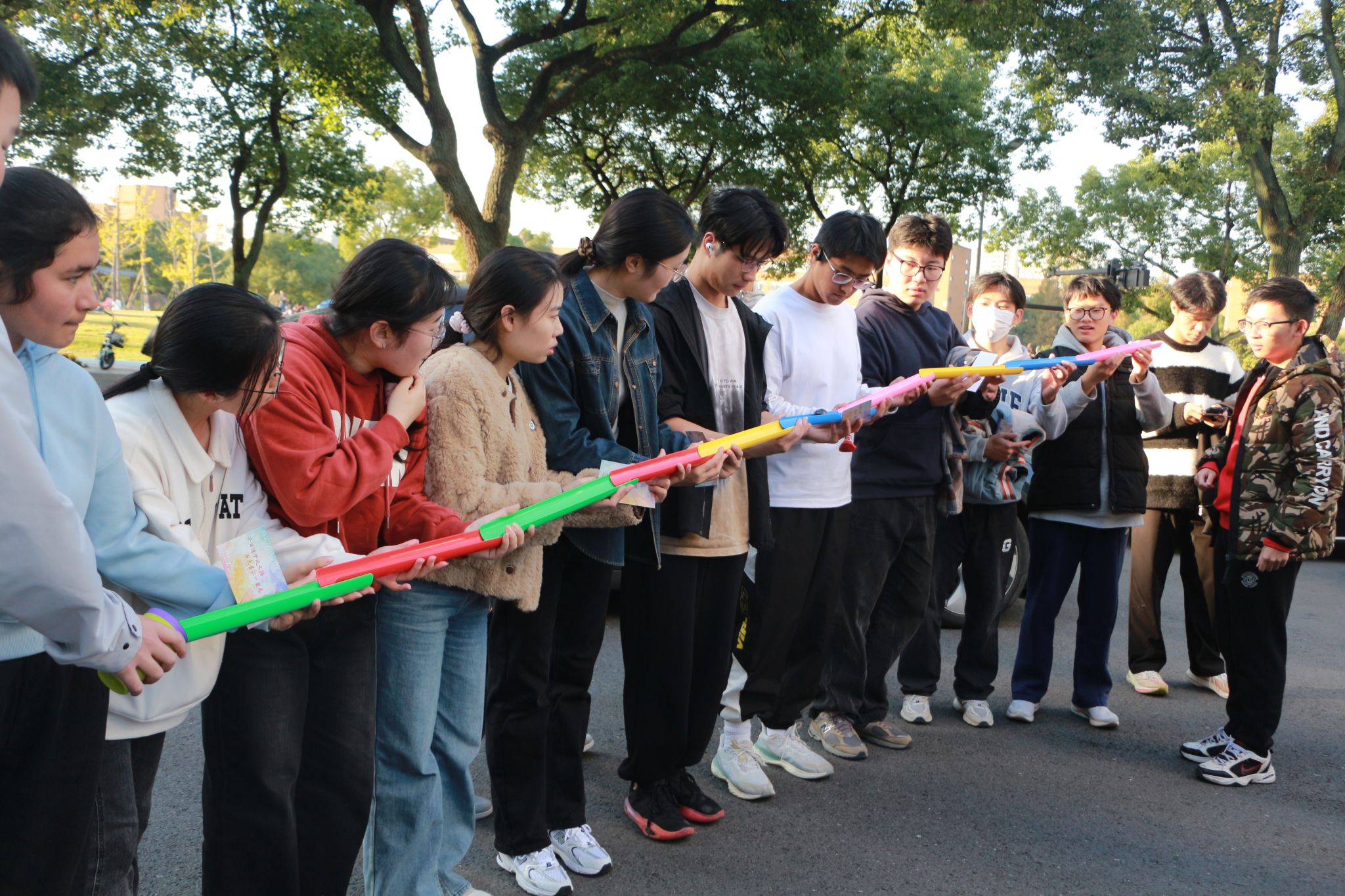 彩虹跑全程分为四个赛段,每个赛段都设有不同的趣味游戏点。在“同心合筑,三砖成塔”段,参与者们需要共同控制一根绳子,合力将三个方块搭在一起。大家齐心协力地拉动绳索,全力以赴地将协作精神融入游戏中。第二个赛段“盲踢挑战,精准对接”设计的活动是射门游戏,蒙上眼睛的参与者依然能够准确无误地将足球踢入球门。迅速地,参赛者们抵达了第三个阶段“槽球相传,连环接力”,他们紧密协作并恰到好处掌握力度,将球依次传递至队友的槽中。公益事业的进展之路绝非坦途,“接力百年开愿景,传承薪火着先鞭。”相信在大家的共同努力下,公益事业将蓬勃发展。活动的第四赛段“齐心杆动,稳立如山”也在有序进行中。参与者们每人手持一根杆子,将其竖立于地面。裁判发出指令后,团队成员需迅速向前,支撑起前方队友的立杆。大家齐心协力,努力保持杆子的平衡。