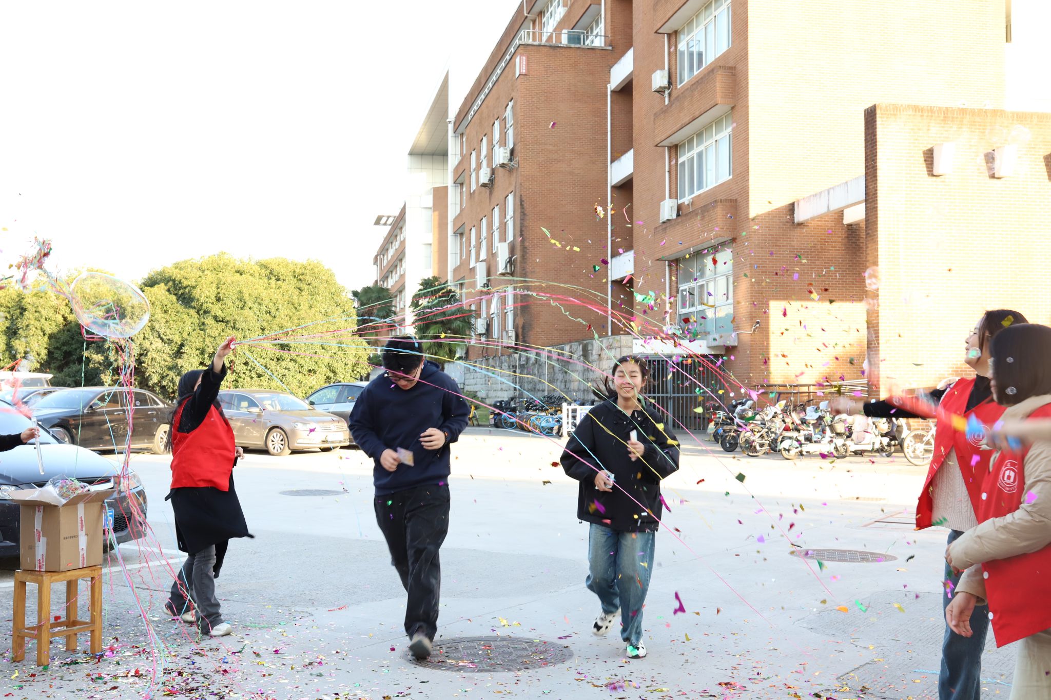 在奔跑与欢笑的交织中,校友和同学们抵达了终点,一场打翻调色盘的派对徐徐展开,人们纷纷抛洒彩带加入这场五彩斑斓的庆祝盛宴。彩带在空中舞动,为天空披上最灿烂的色彩;呼喊中释放出内心的欢乐,让生活和青春展现出更多的活力与绚烂。在缤纷彩虹的绚烂中,大家也纷纷主动捐献爱心,为贵州兴仁的孩子们传递善意。在这一刻,彩虹跑的内涵得以完整,真正成为了师生朋友们放松身心和传递温暖的桥梁,师生也在奔跑和爱心传递中完成了一场教育的闭环。