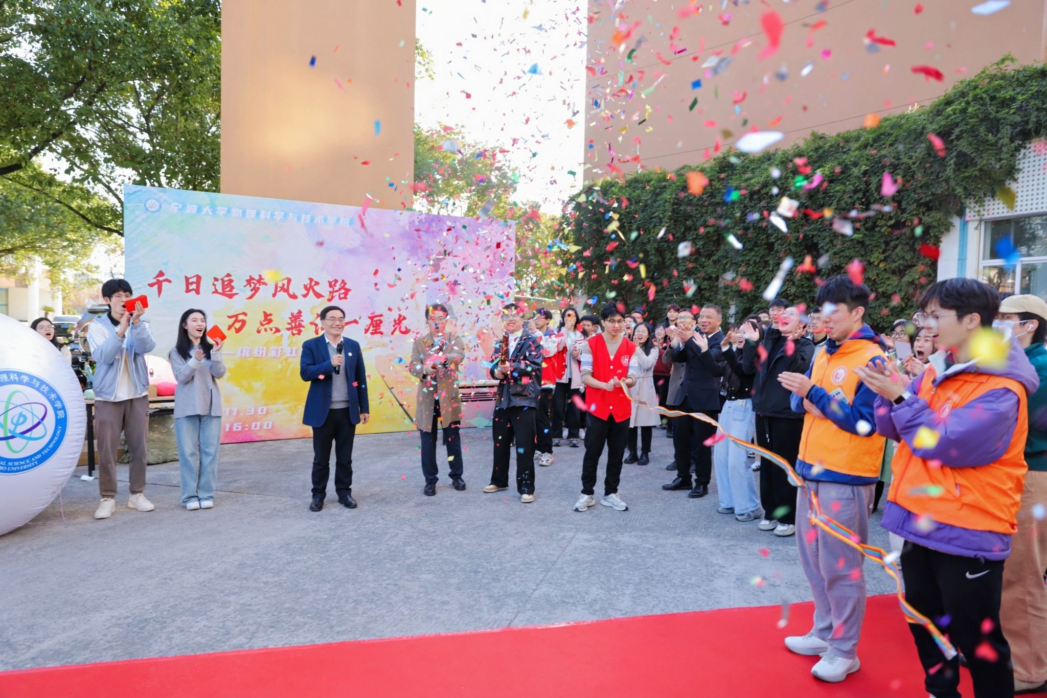 当日下午,来自十余个学院的师生和返校的物院校友们共计200余人齐聚于龙赛理科楼前,蓄势待发;工作人员们有条不紊,一切准备就绪,大家都以饱满的热情迎接即将到来的活动。在彩带飞舞和在礼炮齐鸣中,校长蔡荣根院士宣布彩虹跑开跑。随着蔡校长的一声令下,参与者们一齐冲出起跑线、奔向各个活动打卡点。