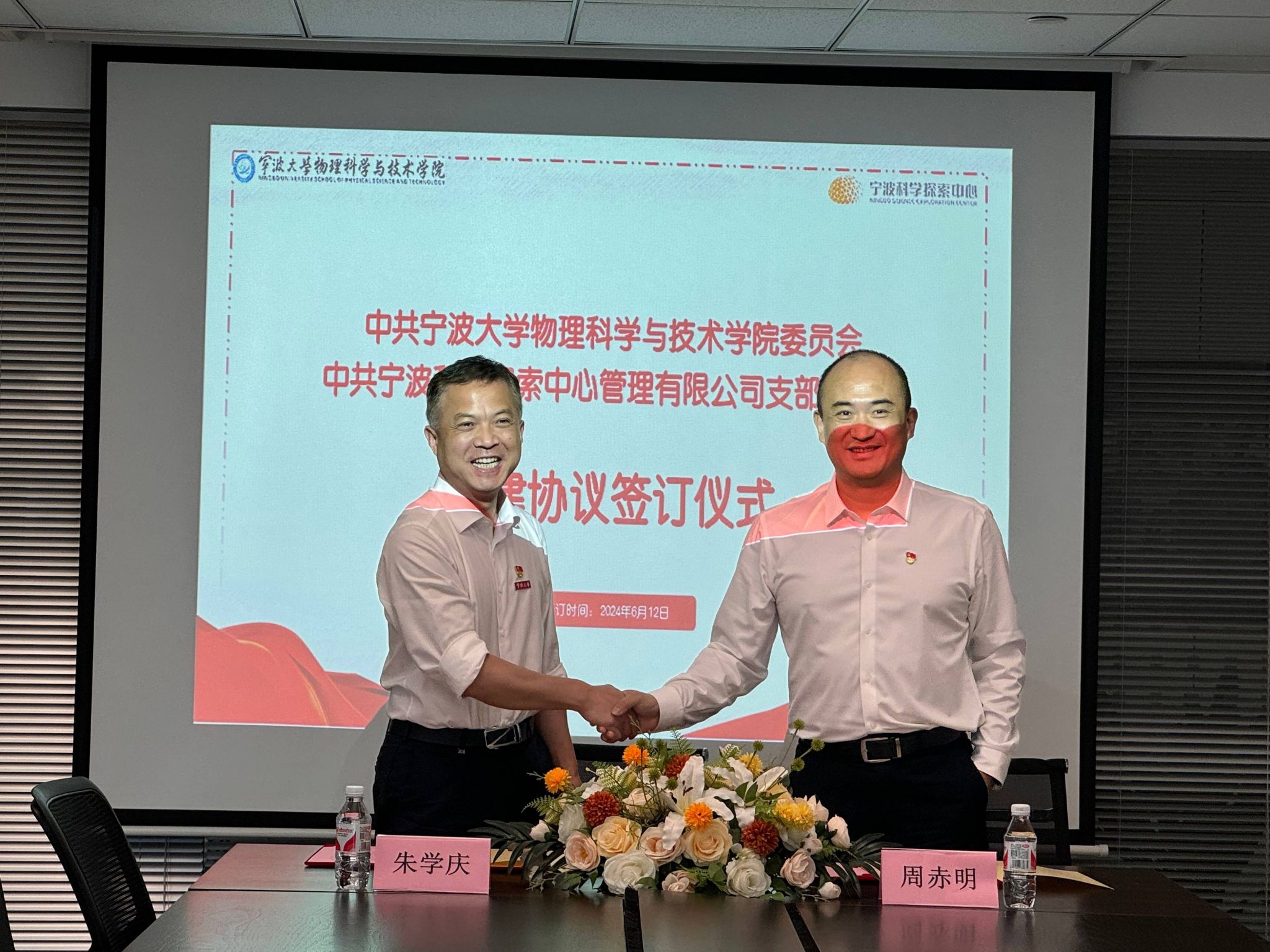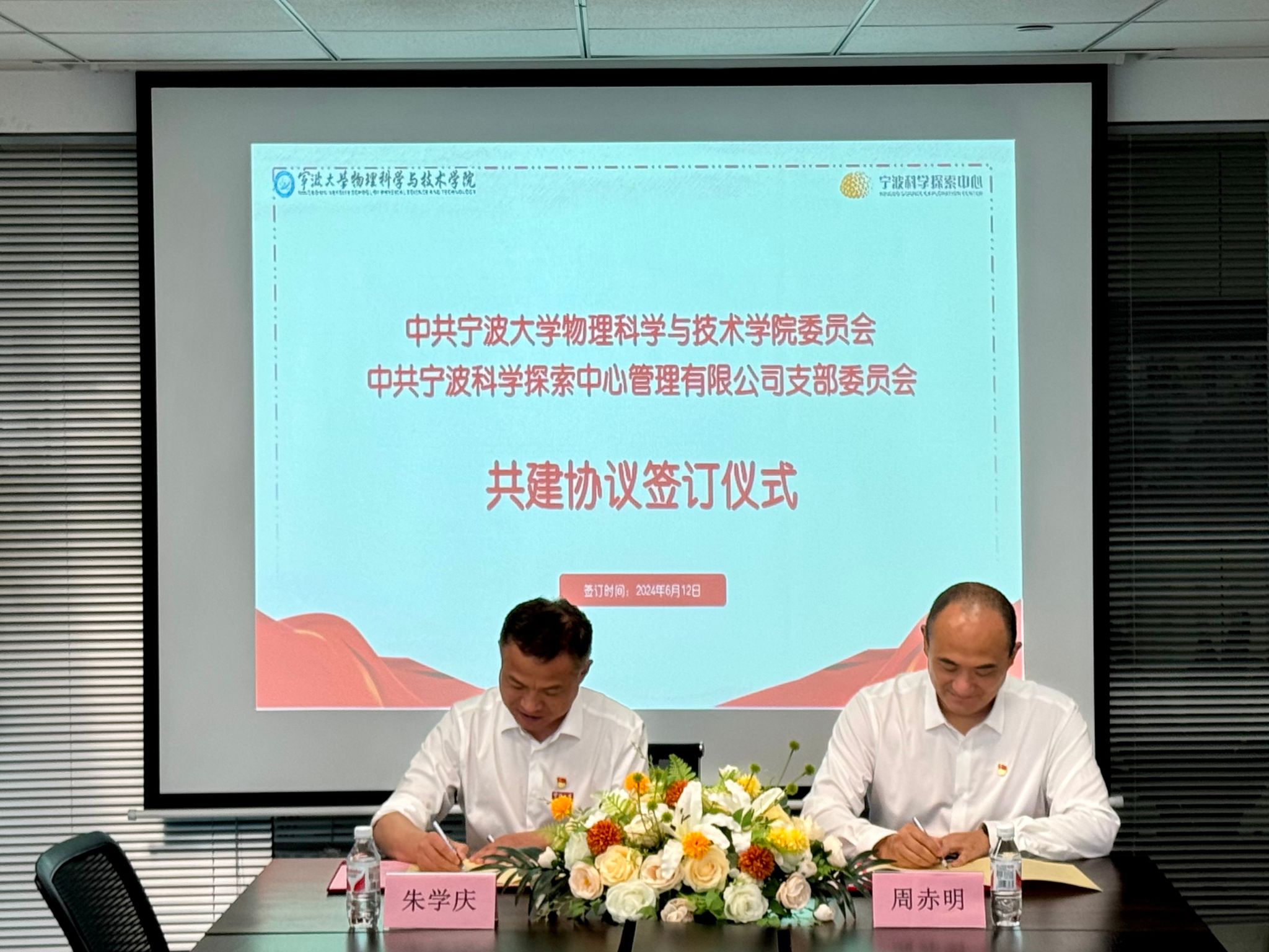 最后,学院党委书记朱学庆与宁波科学探索中心管理有限公司总经理周赤明签订《琉璃神社 党委与宁波科学探索中心党支部共建协议书》。